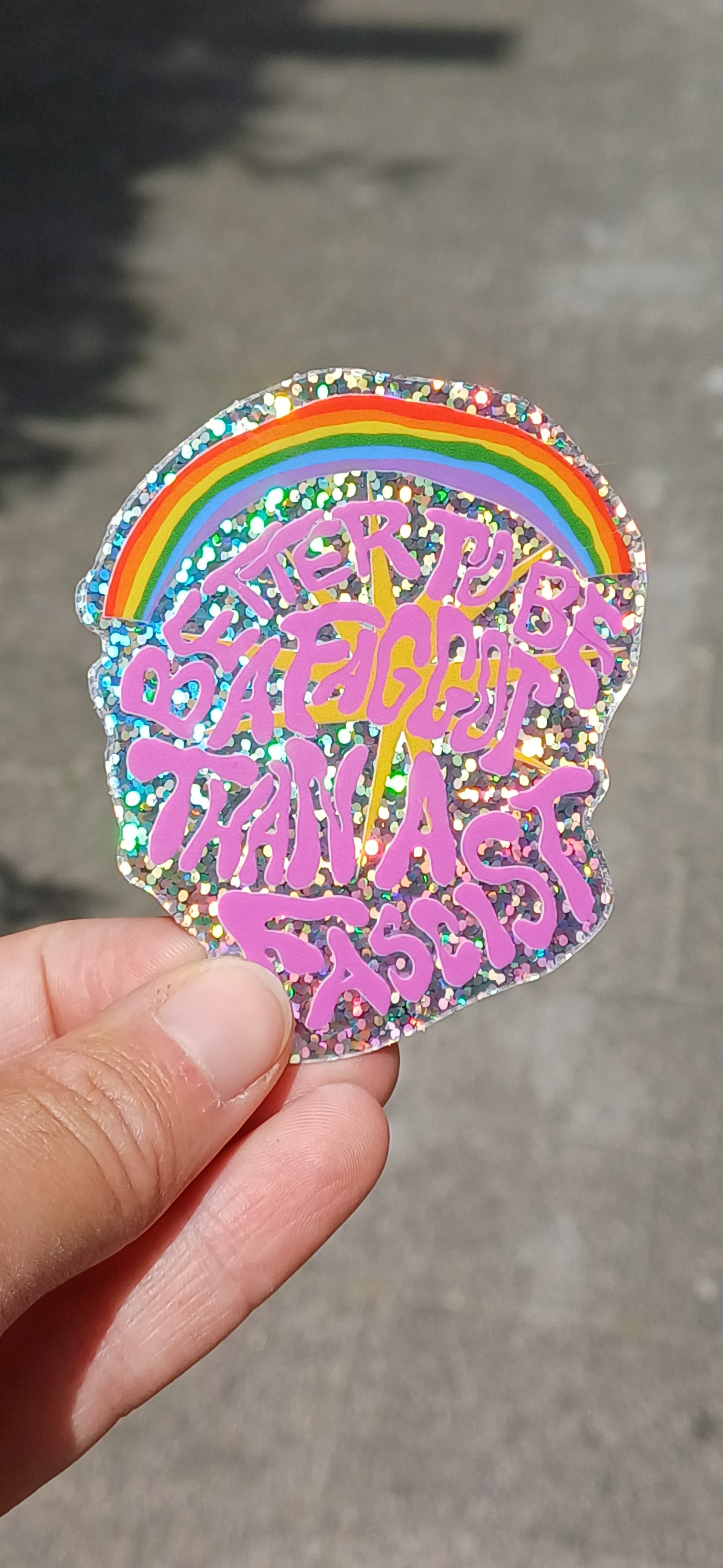 Bold GLITTER sticker, not just a sticker but a sticky statement!! Better be a Faggot for sure!!✨️